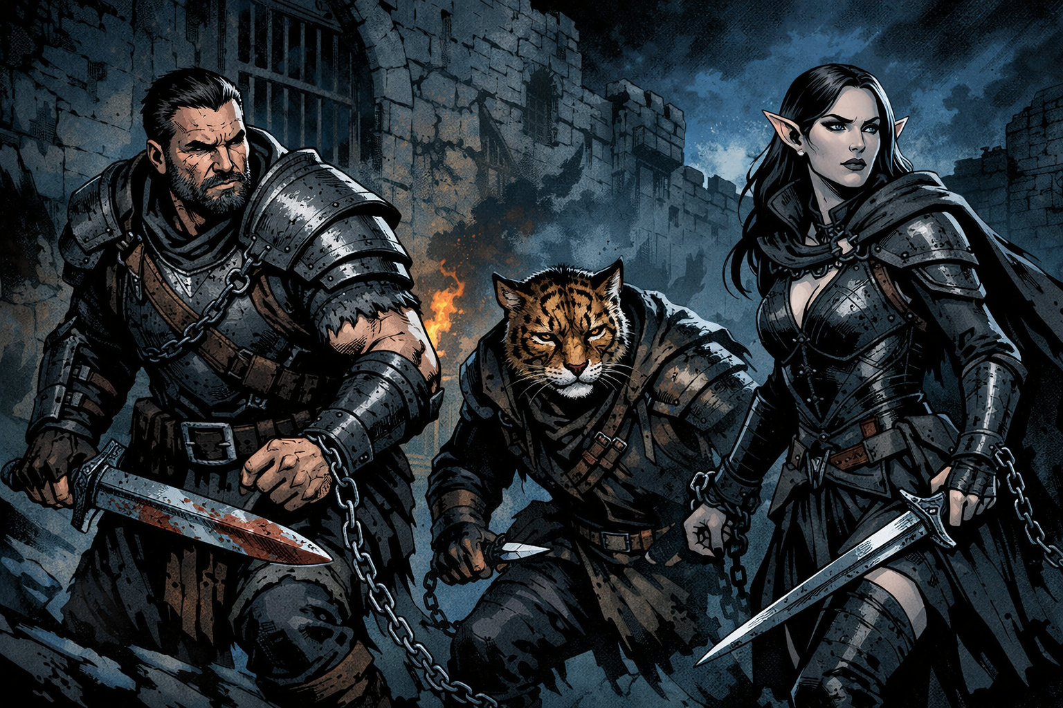 It begins as a single clean detonation somewhere above, not a prolonged barrage but a precise punctuation mark. The cell block shudders. Dust drifts down in lazy sheets. A distant scream rises, then cuts short like a cord snapped tight. For a heartbeat there is silence again, thin and unnatural, followed by the sound of running boots and shouted orders in a language that turns the air sharp. A lock clicks open on its own, or a hinge finally gives, or a key ring skitters across the stones within reach. The PCs feel it immediately: the fort is not in control anymore, and whatever is taking control does not care who survives. Give them an immediate route to act. Bend bars, slip a pin into a lock, wrench a chain against iron. Then punish hesitation. If they wait, opportunity closes: a guard slams a door, a patrol floods the hall, fire reaches straw, or a collapse blocks the clean path and forces the ugly one.