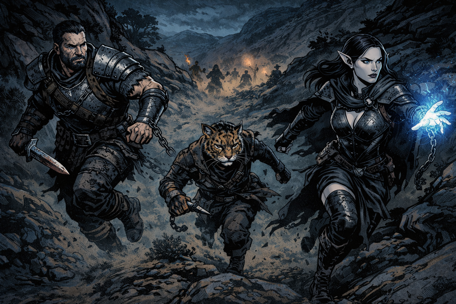 The PCs do not leave the fortress like heroes. They leave like smoke, like something the world tried to choke and failed to finish. Behind them, stone still shudders with distant impacts, the night still flashes with hard blue light, and the screams that were cut short inside the walls do not come back. Outside, the air is colder than it should be, wind scraping across rock and scrub as if the land itself wants to erase their footprints. For a few breaths there is the illusion of freedom, the kind you only feel when you stop hearing keys and chains. Then the truth arrives in the only language it ever uses: sound. Boots on stone. A horn that starts and falters. A shouted command carried on the wind. The fort is not done with them.