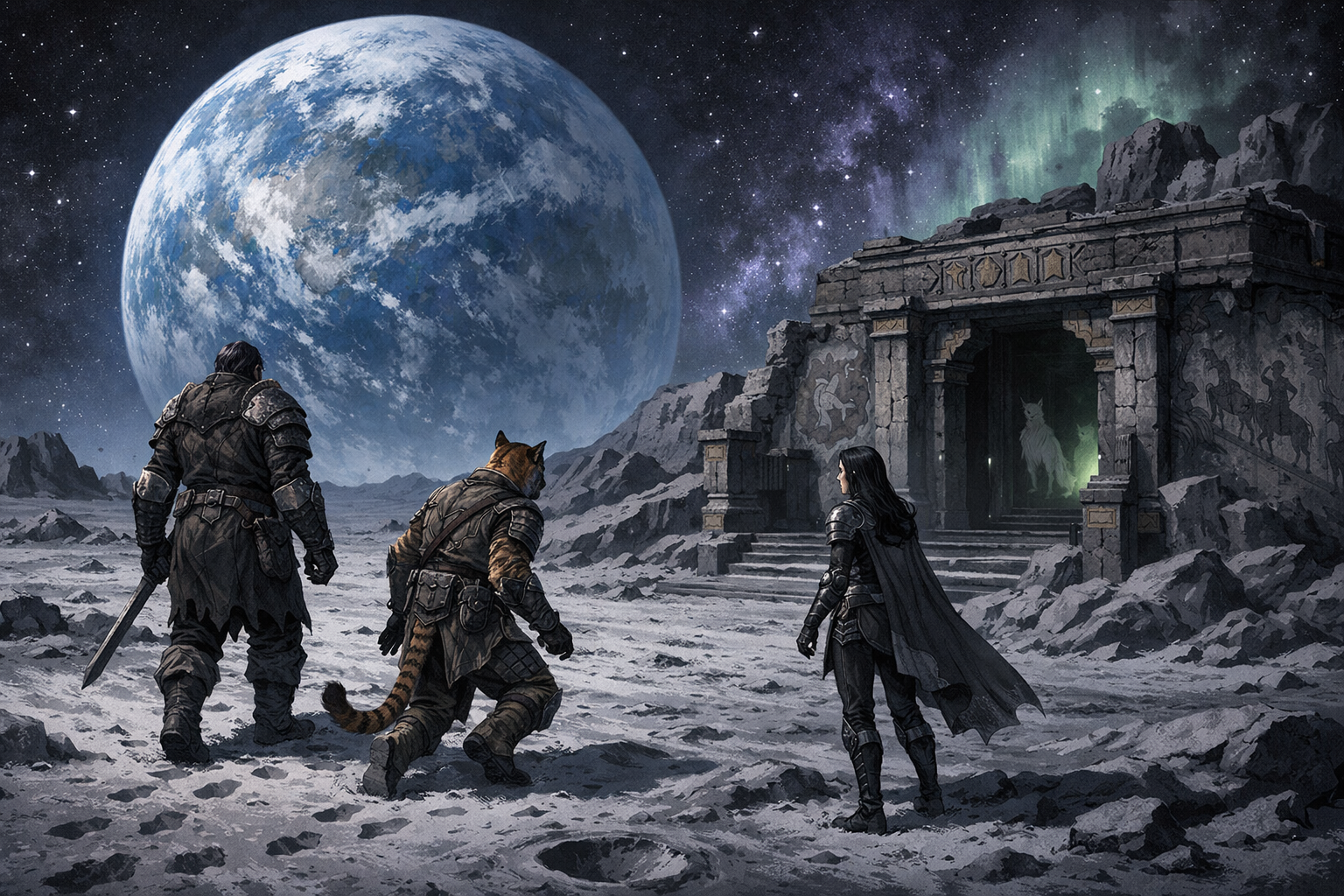 The door is not only physical. It is ideological. It was built to keep the wrong hands out. Give the party a final choice that sets the next scenario. Force it now, risking damage to wards or triggering ancient defenses. Or withdraw to the ship to regroup, translate, and plan, knowing time is not an ally and that something else may have noticed their footprint on the moon.